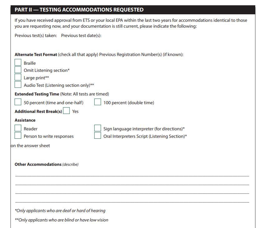 Informujemy także, iż egzamin TOEIC jest dostępny w wersji dla osób z niepełnosprawnością. Jeśli ktoś ma poświadczoną niepełnosprawność, może ten fakt zgłosić podczas rejestracji wypełniając stosowny formularz (Dostosowanie egzaminu TOEIC dla osób niepełnosprawnych - formularz).